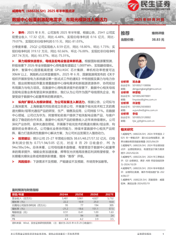 【威腾电气】【20250830】威腾电气-688226.SH-2025年半年报点评_数据中心起量刺激配电需求_布局光模块注入新活力-3页 证券期货研究报告