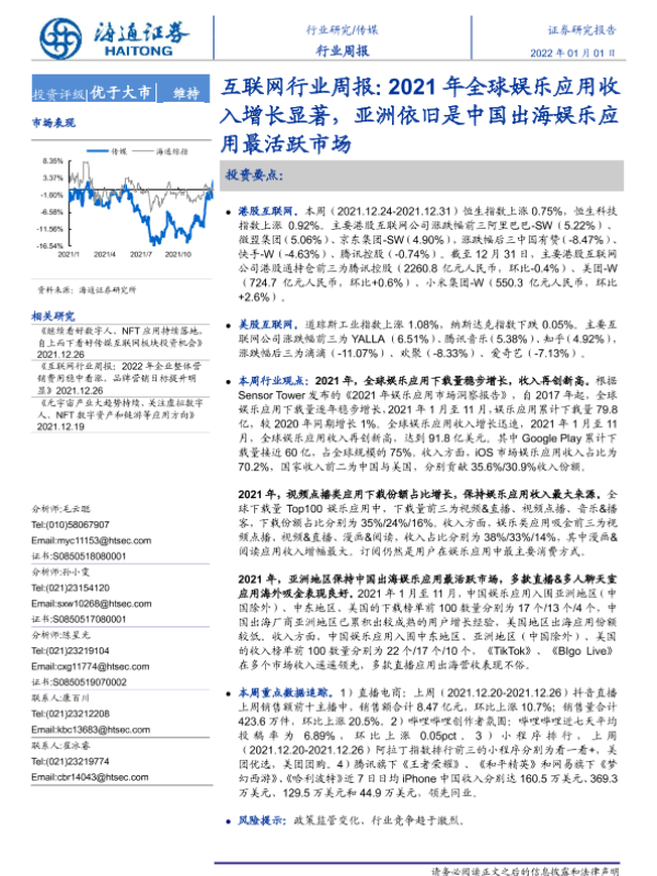 【海通证券】【20220101】20220101-海通证券-互联网行业周报:2021年全球娱乐应用收入增长显著,亚洲依旧是中国出海娱乐应用最活跃市场-10页 行业研究