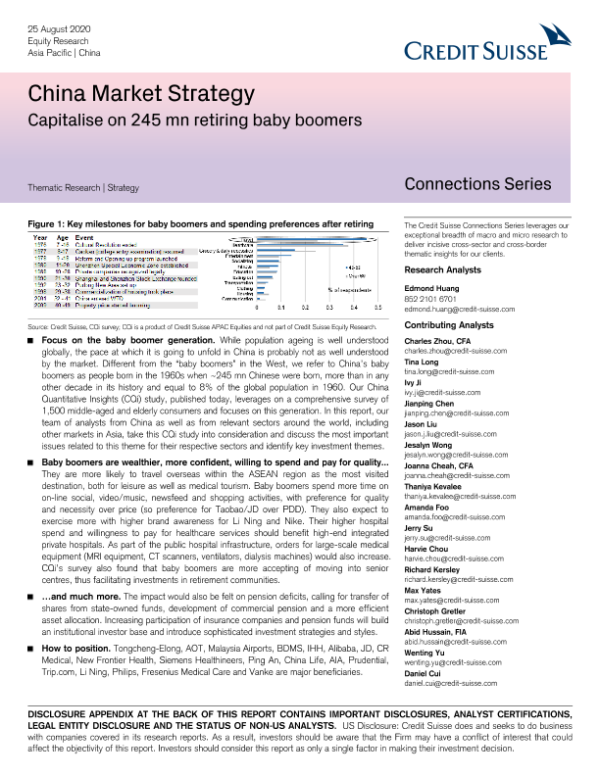 【Credit Suisse】【20200825】瑞信-中国投资策略:2.45亿婴儿潮一代退休人口的投资机会-94页 行业研究