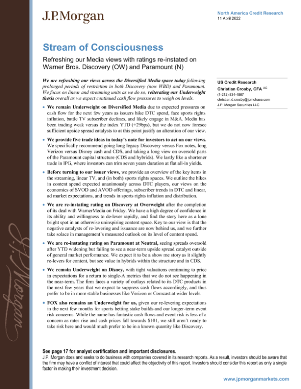 【J.P. Morgan】【20220411】J.P. 摩根-美股投资策略-华纳兄弟探索影业(OW)和派拉蒙影业(N)恢复评级,更新我们的媒体观点-22页 行业研究