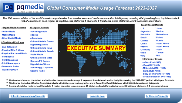 【PQ Media】【20230519】2023-2027年全球媒体消费者使用预测-44页 行业研究