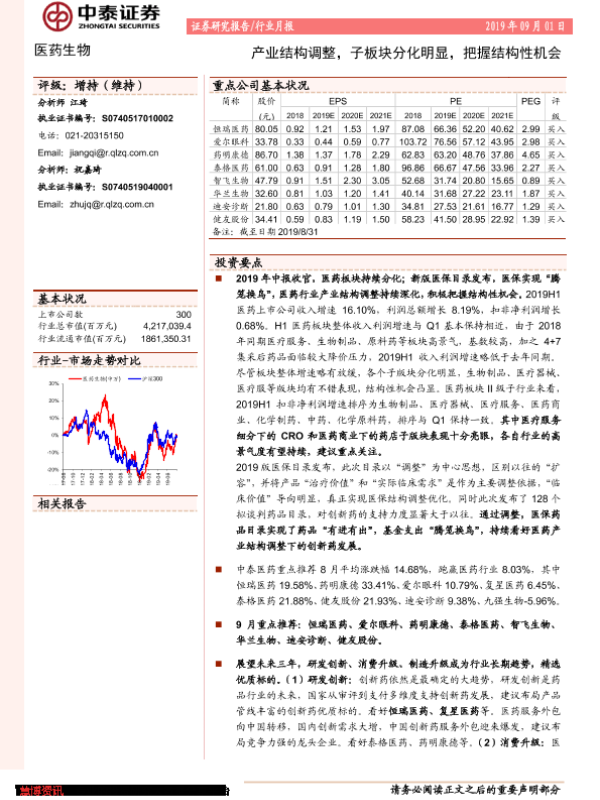 【中泰证券】【20190901】医药生物行业月报:产业结构调整,子板块分化明显,把握结构性机会-19页 行业研究