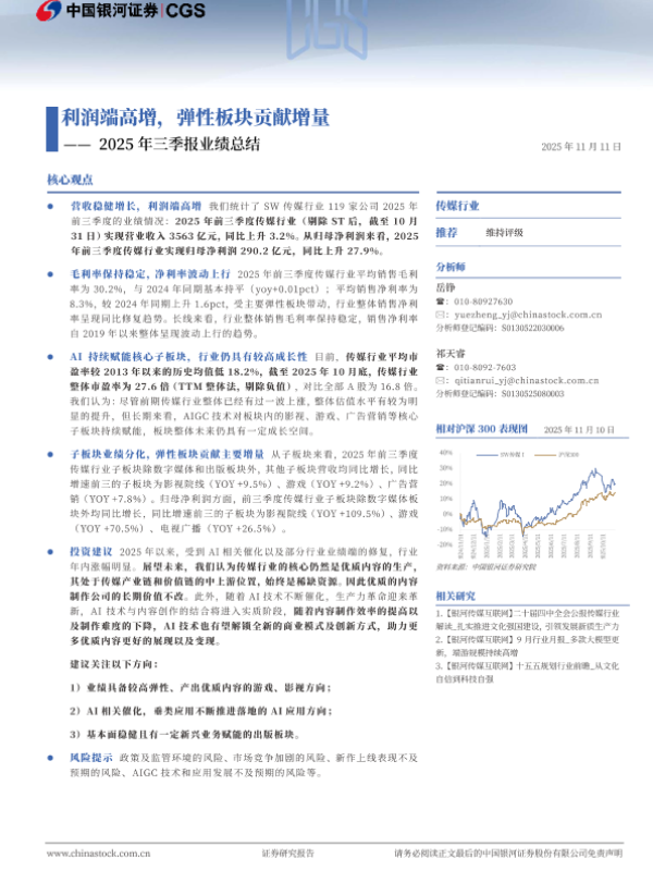 【银河证券】【202511】传媒行业2025年三季报业绩总结:利润端高增,弹性板块贡献增量-24页 证券期货研究报告