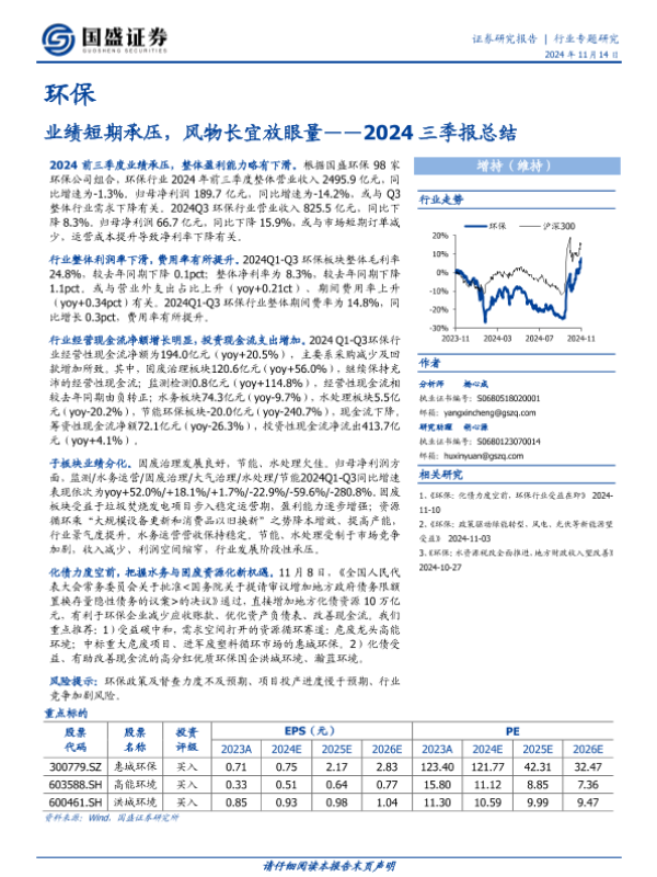 【国盛证券】【20241114】环保2024三季报总结:业绩短期承压,风物长宜放眼量-23页 行业研究