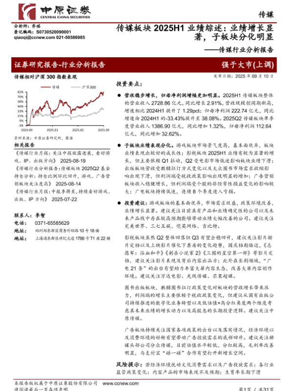 【中原证券】【202509】传媒板块2025H1业绩综述:业绩增长显著,子板块分化明显-31页 证券期货研究报告