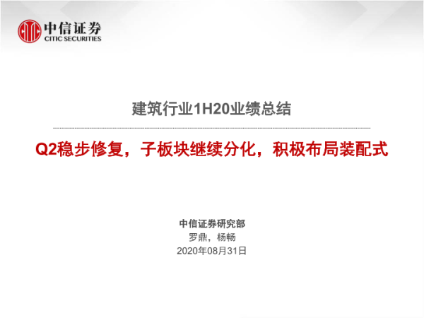 【中信证券】【20200831】建筑行业1H20业绩总结:Q2稳步修复,子板块继续分化,积极布局装配式-84页 行业研究