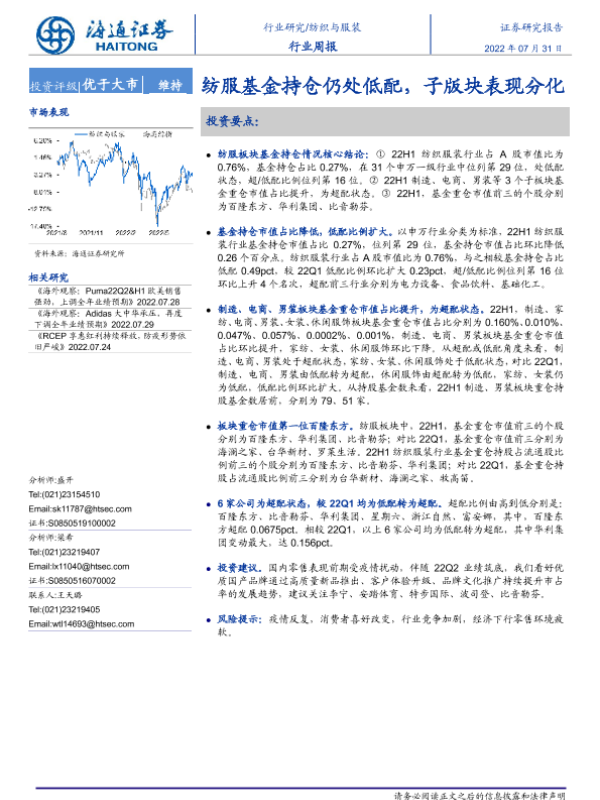 【海通证券】【20220731】20220731-海通证券-纺织与服装行业周报:纺服基金持仓仍处低配,子版块表现分化-10页 行业研究
