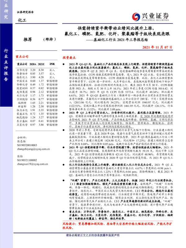 【兴业证券】【20211107】供需持续紧平衡带动业绩同比提升上涨,氟化工、磷肥、氮肥、化纤、聚氨酯等子版块表现亮眼——基础化工行业2021年三季报总结-51页 行业研究