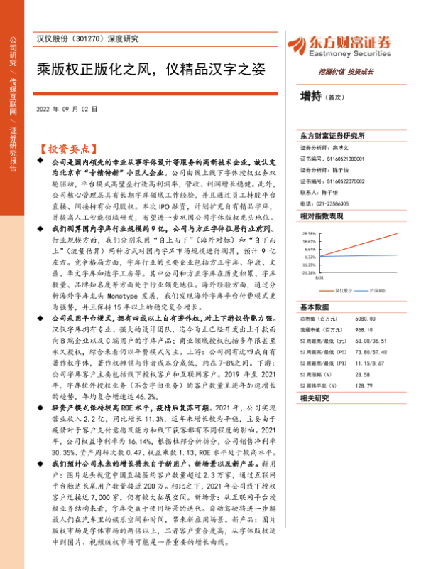 【东方财富证券】【20220902】汉仪股份(301270)深度研究:乘版权正版化之风,仪精品汉字之姿-29页 行业研究