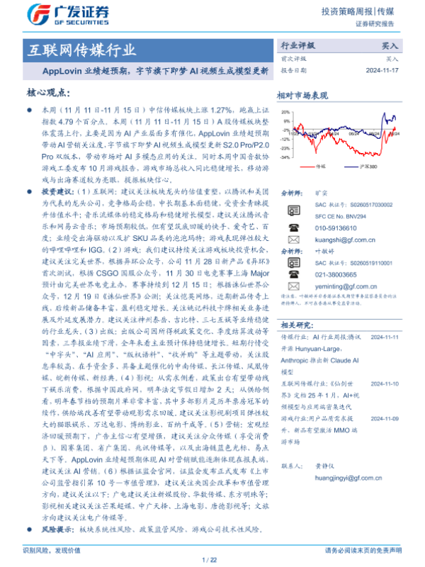 【广发证券】【20241117】20241117-广发证券-互联网传媒行业投资策略周报:AppLovin业绩超预期,字节旗下即梦AI视频生成模型更新-22页 行业研究