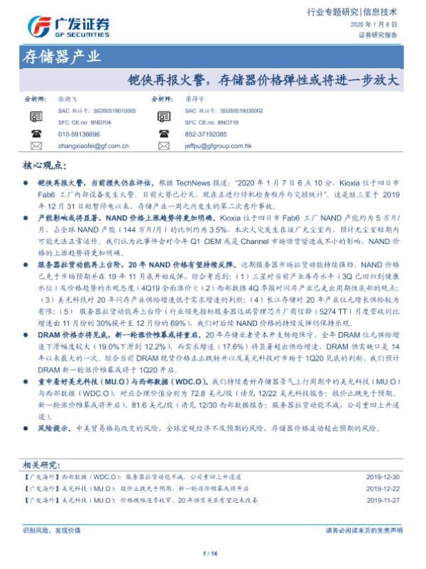 【广发证券】【20200108】铠侠再报火警,存储器价格弹性或将进一步放大-14页 行业研究