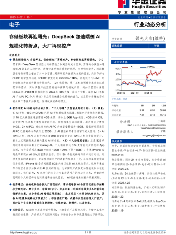 【华金证券】【20250216】电子行业动态分析:存储板块再迎曙光,DeepSeek加速端侧AI规模化转折点,大厂再现控产-11页 行业研究