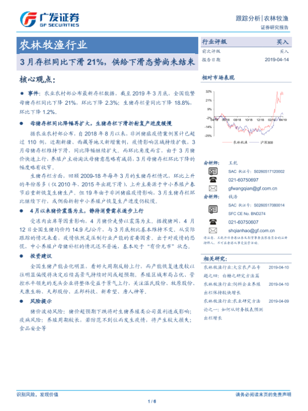 【广发证券】【20190414】农林牧渔行业跟踪分析:3月存栏同比下滑21%,供给下滑态势尚未结束-6页 行业研究