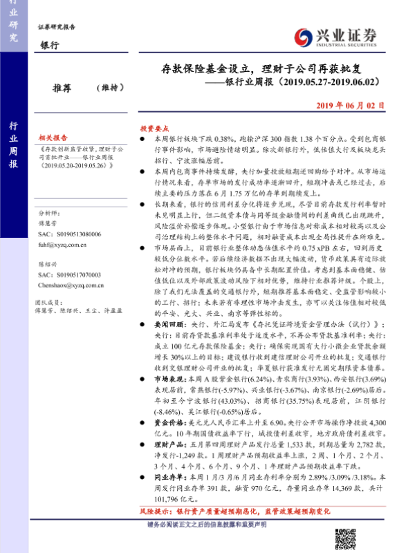 【兴业证券】【20190602】存款保险基金设立,理财子公司再获批复-12页 行业研究