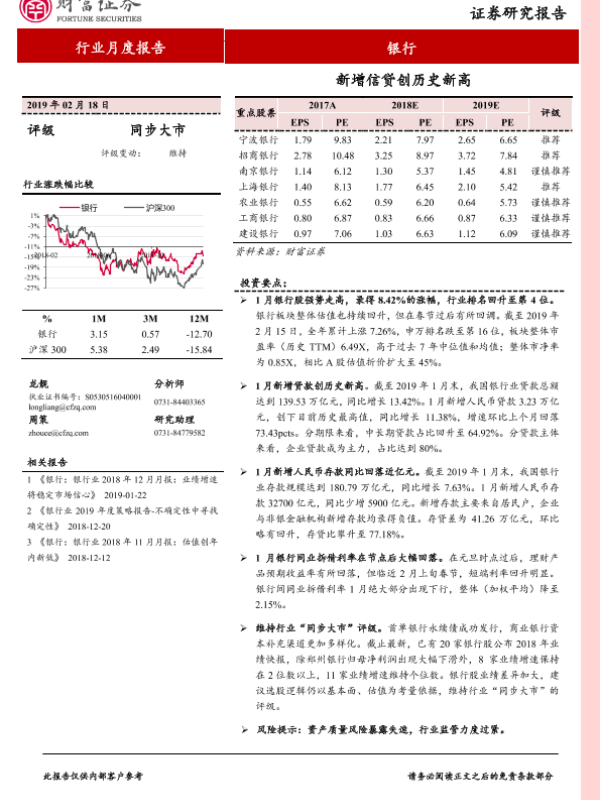 【财信证券】【20190218】银行行业月度报告:新增信贷创历史新高-10页 行业研究