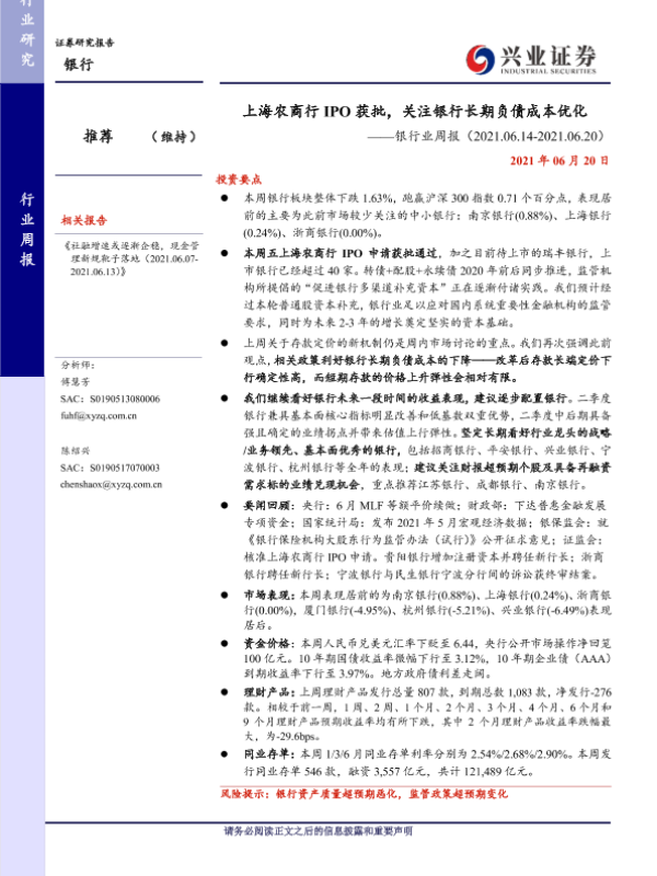 【兴业证券】【20210620】银行业周报:上海农商行IPO获批,关注银行长期负债成本优化-16页 行业研究