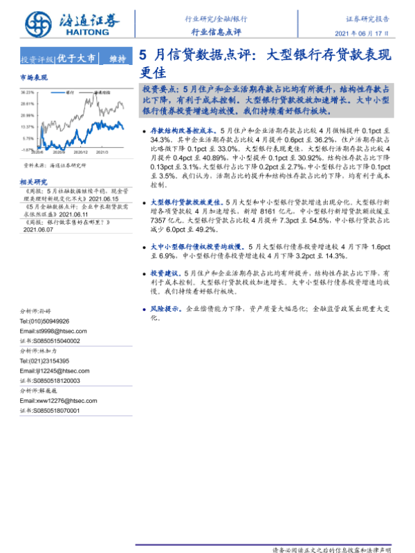 【海通证券】【20210617】5月信贷数据点评:大型银行存贷款表现更佳-2页 行业研究