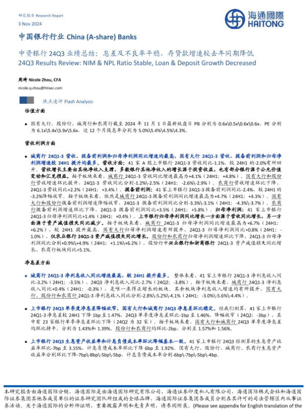 【海通国际】【20241103】中国银行行业中资银行24Q3业绩总结:息差及不良率平稳,存贷款增速较去年同期降低-12页 行业研究