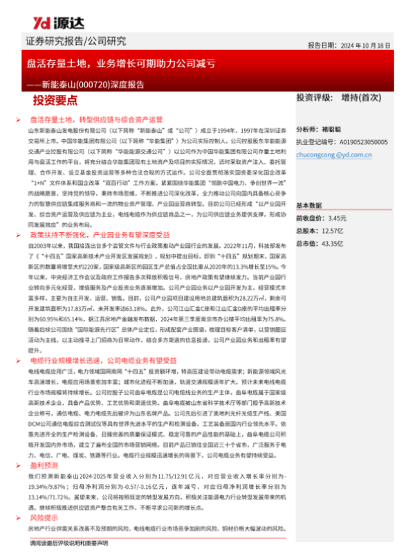 【源达信息】【20241018】20241018-源达信息-新能泰山-000720.SZ-深度报告:盘活存量土地,业务增长可期助力公司减亏-22页 行业研究