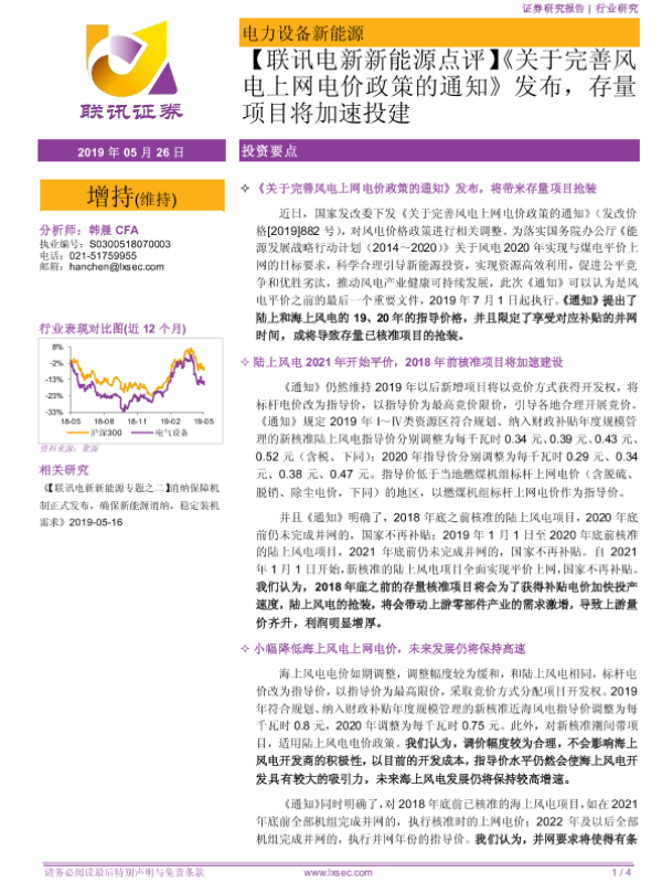 【粤开证券】【20190526】关于完善风电上网电价政策的通知发布,存量项目将加速投建-4页 行业研究