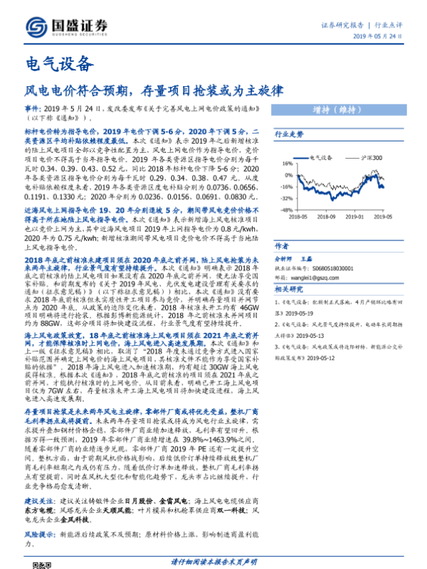 【国盛证券】【20190524】电气设备行业点评:风电电价符合预期,存量项目抢装或为主旋律-3页 行业研究