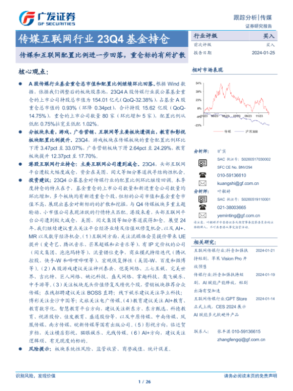 【广发证券】【20240125】23Q4基金持仓:传媒和互联网配置比例进一步回落,重仓标的有所扩散-26页 行业研究