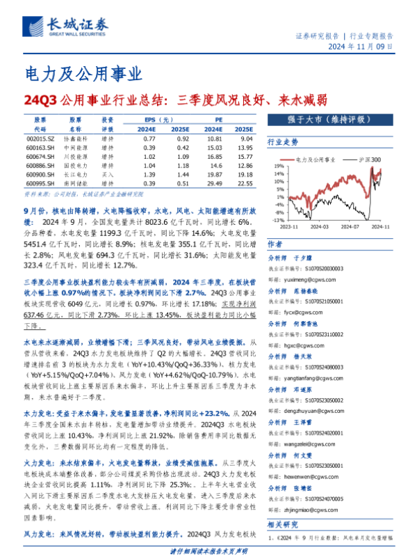 【长城证券】【20241109】24Q3公用事业行业总结:三季度风况良好、来水减弱-18页 行业研究