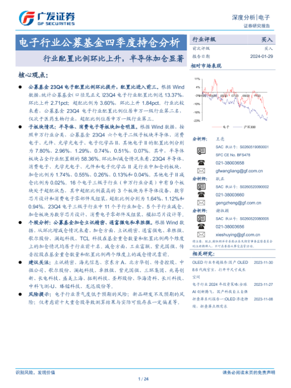 【广发证券】【20240129】电子行业公募基金四季度持仓分析:行业配置比例环比上升,半导体加仓显著-24页 行业研究