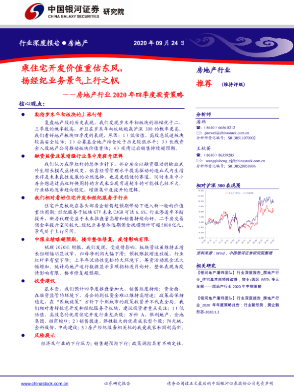 【银河证券】【20200924】房地产行业2020年四季度投资策略:乘住宅开发价值重估东风,扬经纪业务景气上行之帆-27页 行业研究