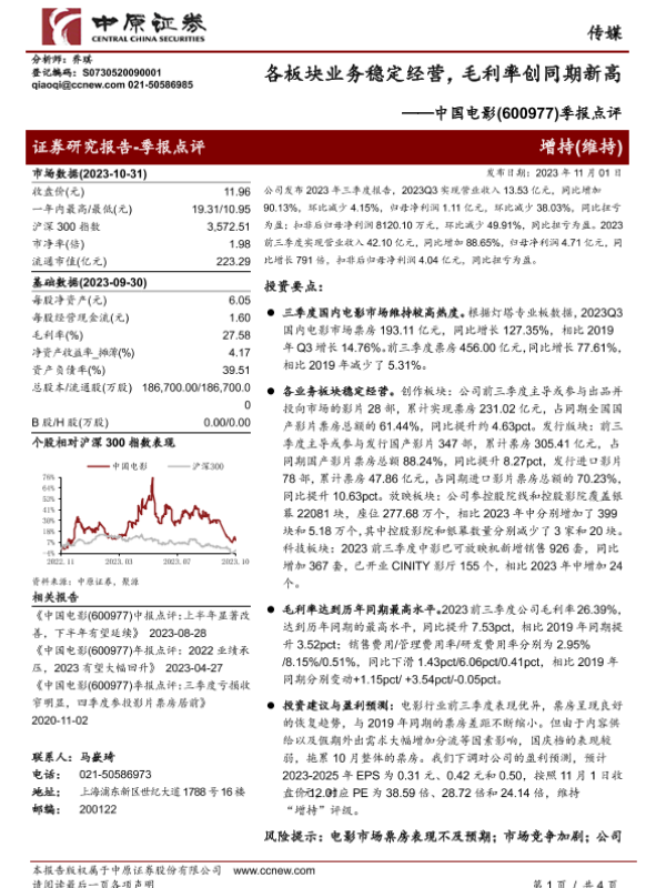 【中原证券】【20201102】中国电影(600977)季报点评:各板块业务稳定经营,毛利率创同期新高-4页 行业研究