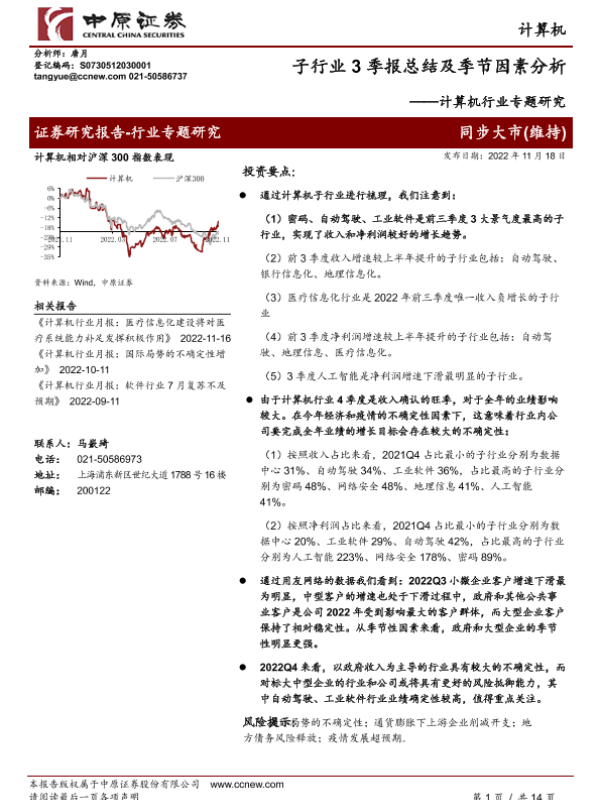 【中原证券】【20221118】计算机行业专题研究:子行业3季报总结及季节因素分析-14页 行业研究