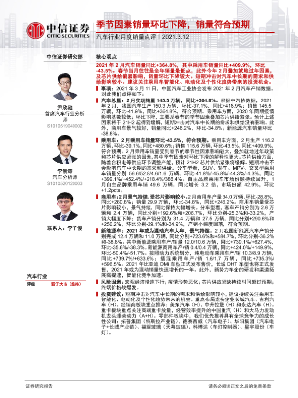 【中信证券】【20210312】汽车行业月度销量点评:季节因素销量环比下降,销量符合预期-2页 行业研究
