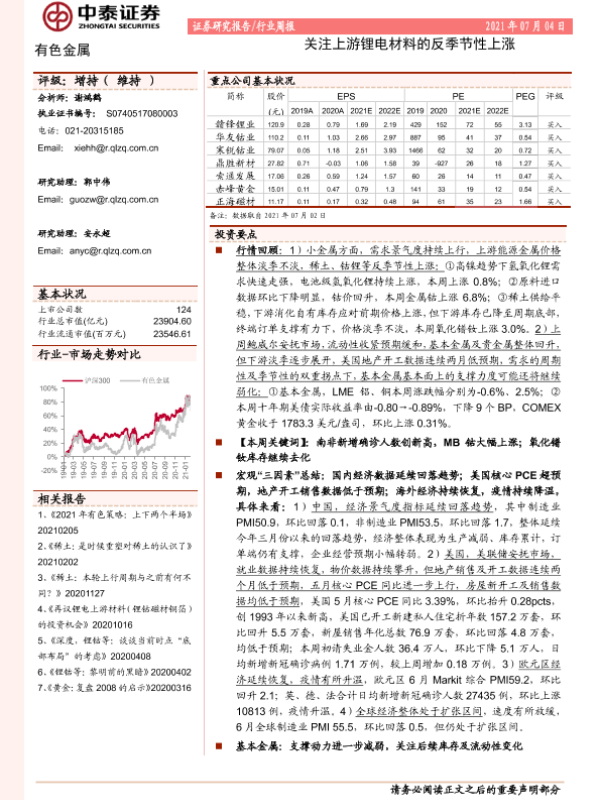 【中泰证券】【20210704】20210704-中泰证券-有色金属行业周报:关注上游锂电材料的反季节性上涨-42页 行业研究