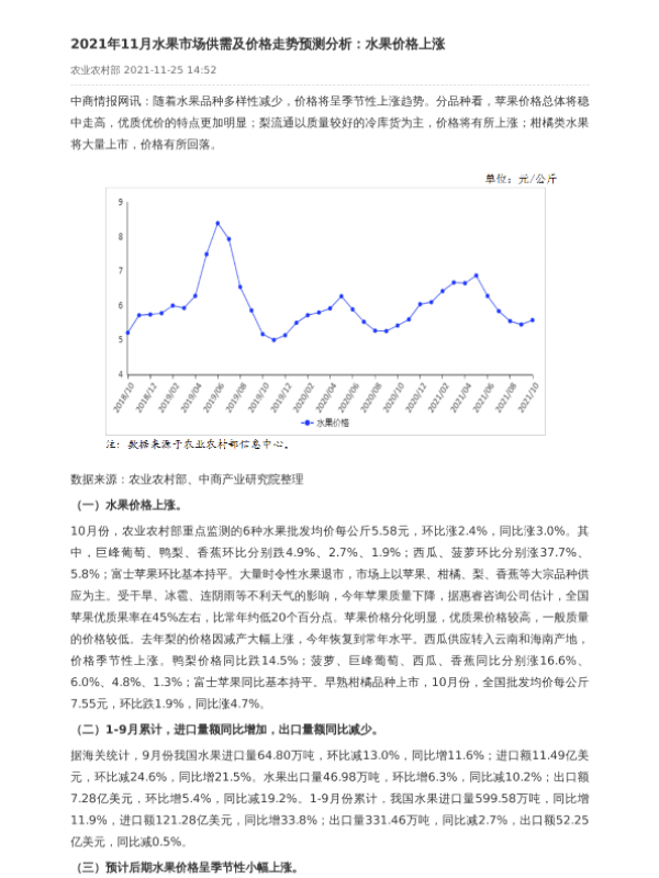 【中商产业研究院】【2021】2021年11月水果市场供需及价格走势预测分析-2页 行业研究