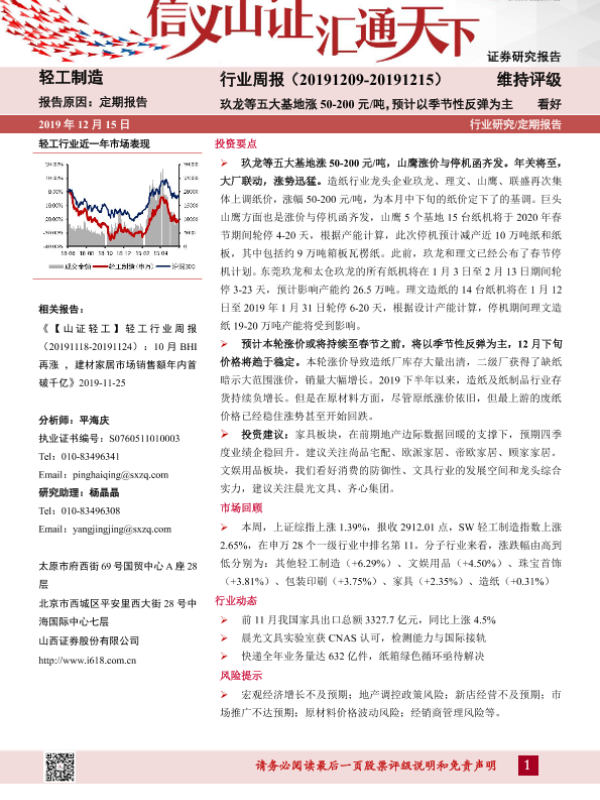 【山西证券】【20191215】20191215-山西证券-轻工行业周报:玖龙等五大基地涨50-200元吨,预计以季节性反弹为主-14页 行业研究
