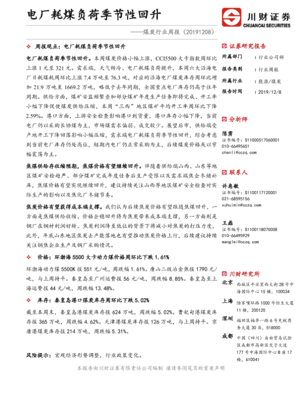 【川财证券】【20191208】电厂耗煤负荷季节性回升-15页 证券期货研究报告
