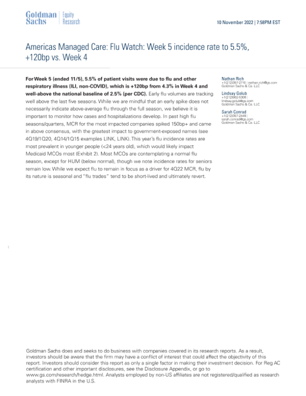 【Goldman Sachs】【20221110】Managed Care_ Flu Watch_ Week 5 incidence rate to 5.5%, +120bp vs. Week 4-7页 行业研究