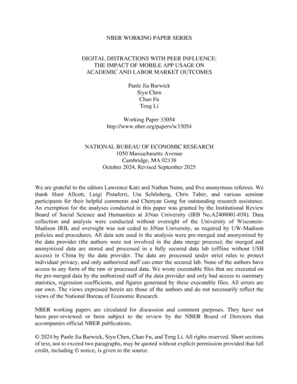 【NATIONAL BUREAU OF ECONOMIC RESEARCH】【202509】Digital Distractions with Peer Influence The Impact of Mobile App Usage on Academic and Labor Market Outcomes-84页 学术论文