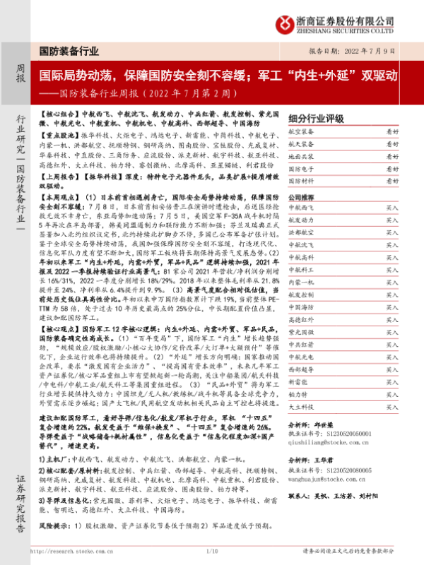 【浙商证券】【20220709】国防装备行业周报(2022年7月第2周):国际局势动荡,保障国防安全刻不容缓;军工“内生+外延”双驱动-10页 行业研究