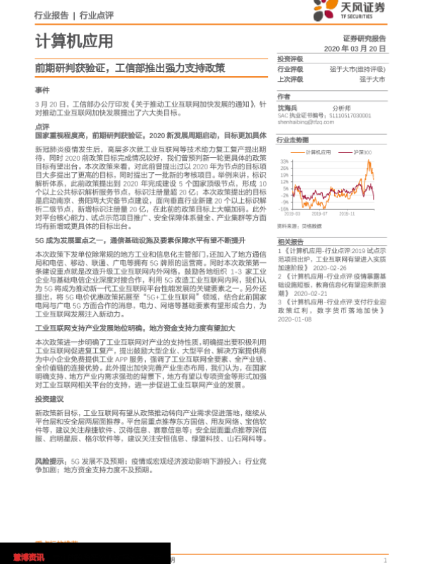 【天风证券】【20200320】计算机应用:前期研判获验证,工信部推出强力支持政策-6页 行业研究