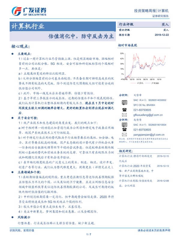 【广发证券】【20191222】20191222-广发证券-计算机行业投资策略周报:估值消化中,防守反击为主-7页 行业研究