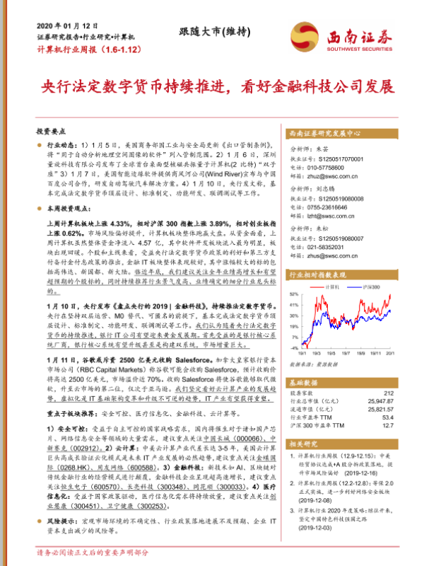 【西南证券】【20200112】计算机行业周报:央行法定数字货币持续推进,看好金融科技公司发展-15页 行业研究