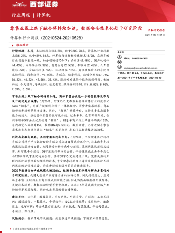 【西部证券】【20210601】20210601-西部证券-计算机行业周报:零售业线上线下融合将持续加速,数据安全技术仍处于研究阶段-16页 行业研究