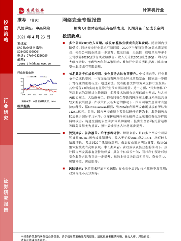 【东莞证券】【20210423】计算机行业网络安全专题报告:板块Q1整体业绩或有亮眼表现,长期具备千亿成长空间-14页 行业研究