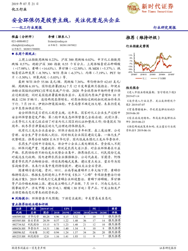 【新时代证券】【20190721】20190721-新时代证券-化工行业周报:安全环保仍是投资主线,关注优质龙头企业-28页 行业研究