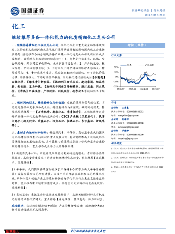 【国盛证券】【20190728】20190728-国盛证券-化工行业周报:继续推荐具备一体化能力的优质精细化工龙头公司-10页 行业研究