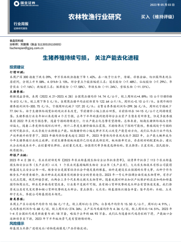 【国金证券】【20230503】20230503-国金证券-农林牧渔行业周报:生猪养殖持续亏损,关注产能去化进程-16页 行业研究