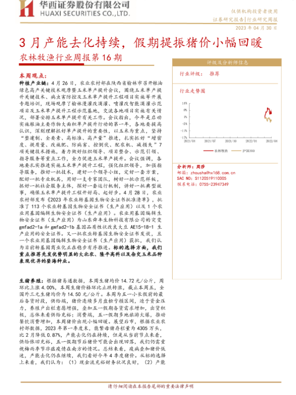 【华西证券】【20230430】3月产能去化持续,假期提振猪价小幅回暖-25页 行业研究