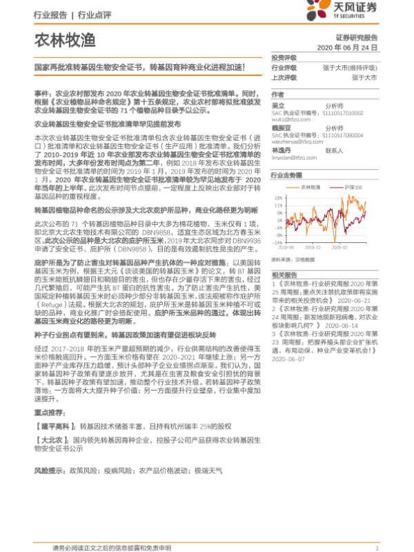 【天风证券】【20200624】国家再批准转基因生物安全证书,转基因育种商业化进程加速!-2页 行业研究