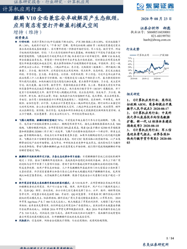 【东吴证券】【20200823】计算机应用行业跟踪周报:麒麟V10全面兼容安卓破解国产生态瓶颈,应用商店有望打开新盈利模式空间-14页 行业研究
